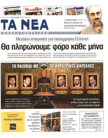 The government reshuffle is to focus on key positions in the economic governance of the country; a ‘new memorandum’ sees additional tax burdens on Greeks; what Stournaras and Lagarde discussed in Paris; the top tax official in the country is ousted despite opposition from Brussels; and country homes sell for bargain-bin prices to foreign buyers. Image credit: Ta Nea newspaper.