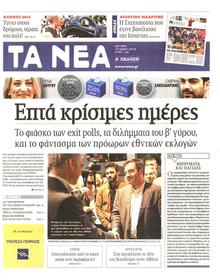 TA NEASeven critical days The exit poll fiasco, the dilemmas of the second round and the ghost of early national elections A critical seven day period is beginning following the first round of local elections in which citizens sent a message in favour of political stability, rejecting in effect the ‘referendum’ rhetoric of SYRIZA. This was presaged by the the exit poll fiasco – which for two hours grossly inflated the percentage of the vote going to SYRIZA candidate Rena Dourou for Attica regional governor in the largest constituency in the country. Syriza: Disappointment over its poor showing in the regional elections Golden Dawn: Shock over the 16% of [mayoral candidate] Kasidiaris in Athens |