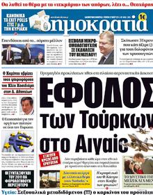 DIMOKRATIAΑ Turkish onslaught in the Aegean Incessant provocations due to air-force war games Erdogan is exporting his crisis Two violations of Greece’s airspace every hour! Frigates and missile launching ships with a crescent moon swept through the Cyclades. |