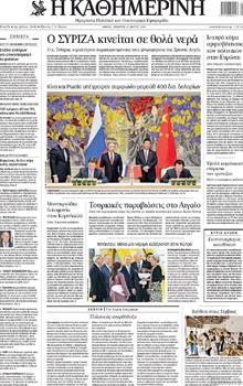 KATHIMERINISYRIZA swimming in murky waters Mr Tsipras described Golden Dawn voters as having gone ‘astray. SYRIZA is ‘fishing’ in murky waters in the final run up to European elections and the second round of local elections. After successive ‘openings’ officials and candidates of the opposition party have made to the voters of Golden Daw, yesterday Alexis Tsipras himself in an interview on SKAI TV described them as having gon ‘astray’ reasoning that the majoirty of them are not neonazis. He did however add that ‘with the leadership of Golden Dawn we have a head-on confrontation.’ On the other hand the Prime Minister Antonis Samaras – and while [former PM] Kostas Karamanlis sent a message of support to New Democracy – diametrically opposed the neonazi party, speaking at an event in remembrance of the battle of Crete in Malema. “Blood sacrifices, and historical memory is grossly offended from those who bear today the sybols of nazism” he underlined while officials from the Prime Ministerial mansion describe SYRIZA’s move as extreme and opportunistic. Mr Evangelos Venizelos called on SYRIZA to join the fight against nazis and Golden Dawn and stressed that ‘it is unthinkable and historically forbidden to flirt in any way with these forces.’ |