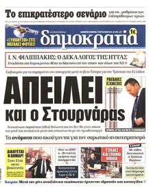 DIMOKRATIAThreats also from Stournaras He is blackmailed in staying at the Finance Ministry following Tsipras’s veto over him taking over the Bank of GreeceHe announced his resignation (yesterday) stating that he was not going to become a punching bag and then recalled it following a discussion with the prime minister. |