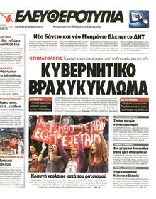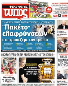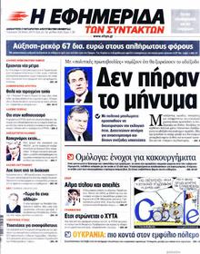 ELEFTHEROTYPIAThe IMF sees a new loan and a new Memorandum The IMF is expected today to decide over the terms, preconditions and demands on the Greek economy for the coming years. There is information that the IMF’s report which will potentially be made public in the coming week with highlight the need for a new loan to Greece in order to cover the fiscal gap which arises for 2015. At the same time it notes the commitment of the Greek government to extend current tax measures such as the solidarity tax in order to cover the fiscal gap. The only ‘sweetener’ is the approval for the release of the ‘double’ tranche of 3.5 billion euros. |