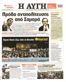 ΤΑ ΝΕΑVote – “deep breath” / 153 nods to the government* Personal confrontations with heavy expressions in the Parliament. Samaras: We will not do you a favor. The elections will be held in 2016. Venizelos: No new measures, no new cuts to the wages. *Greek Parliament consists of 300 MPs. The government needs the support of at least 151 to be able to govern the country. Now, it has the support of 153, since Theodora Tzakri, a PASOK MP, voted yesterday against it and was expelled from the party. |