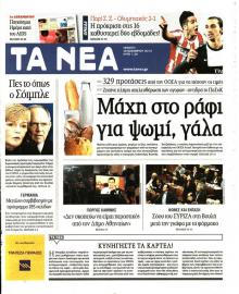 KATHIMERINITug of War Between Athens and Troika A tug of war over the timing of the troika’s (representatives of the IMF, ECB and EC) arrival is underway, as the distance between Athens and the lender’s representatives over the issues of foreclosed home auctions and mass lay-offs remains large, due to the rigid stance of PASOK MPs. Finance Minister Giannis Stournaras conducted a tele-conference with the troika yesterday with the aim of bringing the date for their return forward to next Monday, as opposed to the week after next. |