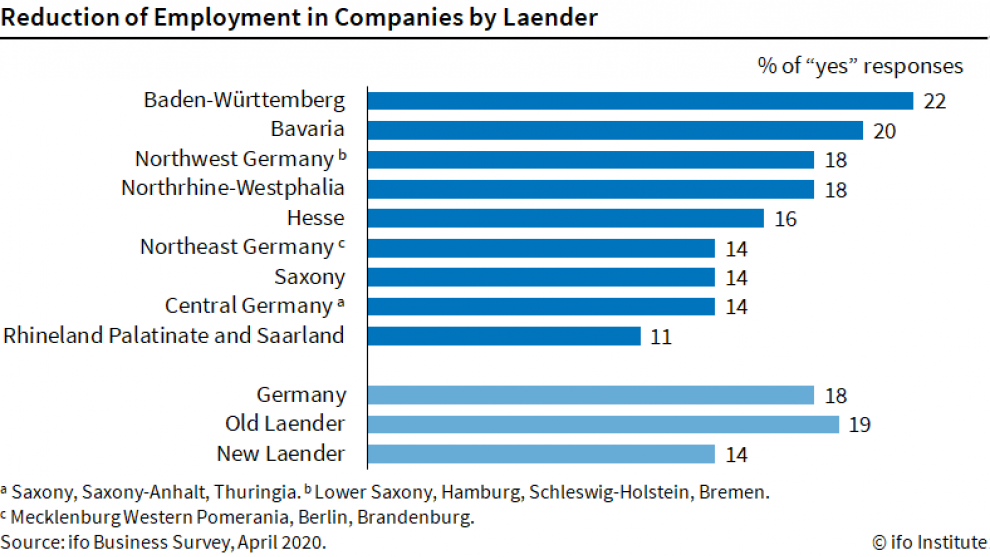 Εμφανώς λιγότερες περικοπές αναμένονται στα κρατίδια του Ζάαρ και της Ρηνανίας-Παλατινάτου, με το 11% των επιχειρήσεων να ετοιμάζουν απολύσεις, σύμφωνα με τους συμμετέχοντες στην έρευνα του Ifo.