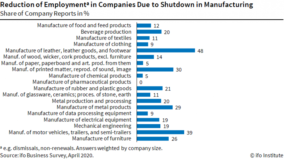 Όπως αναφέρει η έρευνα, σε απολύσεις ή μη ανανεώσεις συμβάσεων αποφάσισε να προχωρήσει τον Απρίλιο το 58% των επιχειρήσεων στην εστίαση, το 50% των ξενοδοχείων, το 43% των ταξιδιωτικών γραφείων και το 39% των επιχειρήσεων στην αυτοκινητοβιομηχανία. Σημειώνεται ότι το 18% των επιχειρήσεων στη Γερμανία εν γένει φέρονται να έχουν προχωρήσει ήδη σε μείωση προσωπικού.