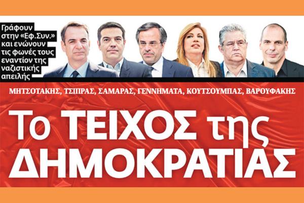 Ένα τέτοιο πρωτοσέλιδο θα είχε νόημα στην Καθημερινή ή το Πρώτο Θέμα, δύο εφημερίδες δηλαδή που απευθύνονται σε συντηρητικό κοινό, το οποίο έχει γαλουχηθεί με τη θεωρία των δύο άκρων. Και πάλι όμως, θα χρειαζόταν άλλου τύπου επιχειρηματολογία από τον Μητσοτάκη και τον Σαμαρά για να καταδειχθεί ότι ο ναζισμός είναι θανάσιμος κίνδυνος και αυτοτελές φαινόμενο που δεν έχει καμία σχέση με την αριστερά, τον λαϊκισμό και τις εργατικές κινητοποιήσεις και για αυτό χρειάζεται να ορθωθεί ένα «δημοκρατικό τείχος» απέναντί του. Αλλά αυτές οι εφημερίδες δεν συμμερίζονται ετούτη τη θέση, ούτε προφανώς, η ηγεσία της δεξιάς.
