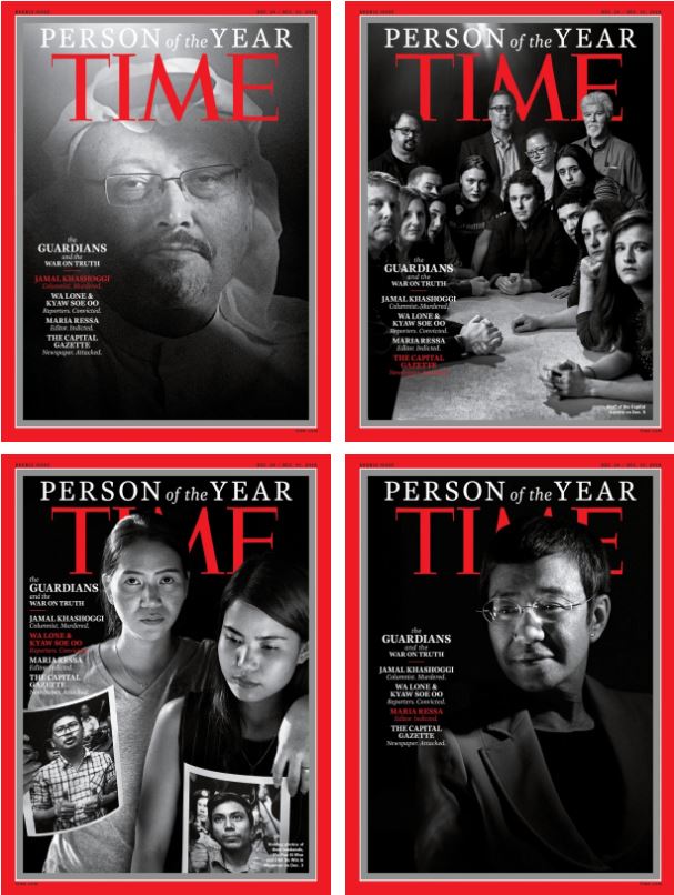 Εκτός του Σαουδάραβα δημοσιογράφου, το εβδομαδιαίο περιοδικό αποφάσισε ως πρόσωπα της χρονιάς τους «φύλακες δημοσιογράφους»: τη σύνταξη της αμερικανικής τοπικής εφημερίδας Capital Gazette που θρήνησε πέντε μέλη της κατά την επίθεση που πραγματοποιήθηκε το περασμένο καλοκαίρι στην Ανάπολη του Μέριλαντ, την Φιλιππινέζα δημοσιογράφο, Μαρία Ρέσα και τους δύο Βιρμανούς ρεπόρτερ του Reuters, Ουά Λόουν και Κέι Σου Όου, που σήμερα βρίσκονται στη φυλακή.