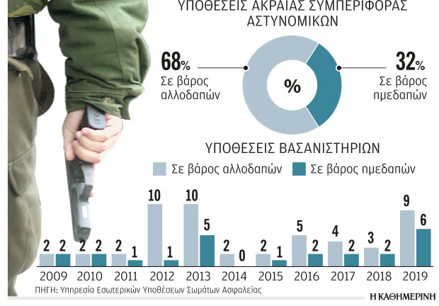 Σημειώνεται πως κατά τα ίδια στοιχεία, ο αριθμός υποθέσεων βασανιστηρίων την τελευταία δεκαετία ξεπερνάει τις 70, ενώ την ίδια περίοδο, τα περιστατικά αυθαιρεσίας και «ακραίας αστυνομικής συμπεριφοράς προσεγγίζουν τα 250, με τις 165 περιπτώσεις να βρίσκουν στη θέση των θυμάτων αλλοδαπούς πολίτες. Σημειώνεται δε πως το 2019, οι υποθέσεις αστυνομικής αυθαιρεσίας επιστρέφουν στα επίπεδα του 2012-2013, όπως αποτυπώνεται στον πίνακα που δημοσιεύει η ίδια εφημερίδα.
