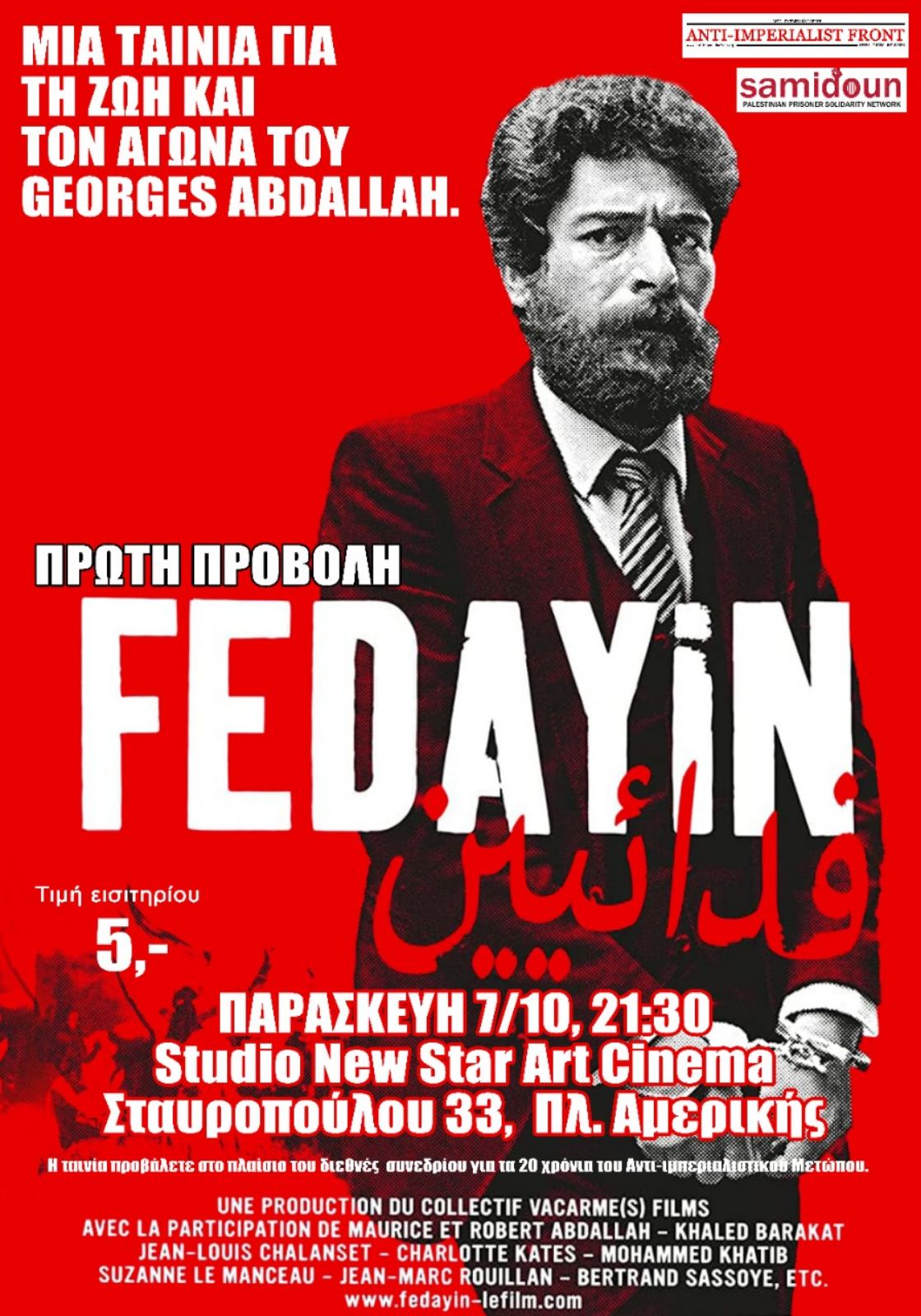Ως Aντιιμπεριαλιστικό Μέτωπο και Samidoun- Δίκτυο για τους Παλαιστίνιους Κρατούμενους, διοργανώνουμε την πρώτη προβολή της ταινίας Fedayin, ντοκυμαντέρ για τη ζωή και τον αγώνα του μακροβιότερου πολιτικού κρατούμενου στην Ευρώπη, 38 χρόνια κρατούμενος στις γαλλικές φυλακές, του αλύγιστου Λιβανέζου κομμουνιστή, μαχητή της Παλαιστινιακής υπόθεσης, Georges Abdallah.