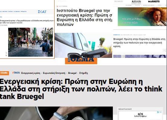 «Τα στοιχεία του ευρωπαϊκού think tank δείχνουν ότι η Ελλάδα έχει δαπανήσει μέχρι τώρα σε μέτρα στήριξης παραπάνω από το 3,5 % του ΑΕΠ με το κόστος να προσεγγίζει τα 40 δισεκατομμύρια ευρώ» γράφει για παράδειγμα το «Πρώτο Θέμα» στην πρώτη παράγραφο του άρθρου με τίτλο «ενεργειακή κρίση: Πρώτη στην Ευρώπη η Ελλάδα στη στήριξη των πολιτών, λέει το think tank Bruegel».