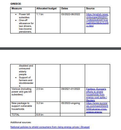 Η Ελλάδα εμφανίζεται να έχει δαπανήσει 6,8 δισ. ευρώ για την αντιμετώπιση της ενεργειακής κρίσης. Υπάρχει εδώ μία υποσημείωση Σχεδόν το μισό, τα 3,2 δισ. αφορούν το πακέτο που εξαγγέλθηκε τον Μάιο, με την «επιστροφή έως και 600 ευρώ» (fuel pass) και τις νέες, μεγαλύτερες επιδοτήσεις στους λογαριασμούς από τον Ιούνιο, μαζί με την υπόσχεση για «αναστολή της ρήτρας αναπροσαρμογής των Ιούλιο». Είναι δηλαδή ένα πακέτο που δεν έχει φτάσει ακόμα στην «ελάφρυνση» των πολιτών, καθώς τα χρήματα δεν έχουν φύγει από τα κρατικά ταμεία. Υπάρχει δηλαδή μία ελληνική ιδιαιτερότητα που προκύπτει από την καθυστερημένη αντίδραση της κυβέρνησης στην ενεργειακή κρίση. Μολονότι και άλλες χώρες έχουν εξαγγείλει νέα μέτρα για μετά τον Μάιο, που μετριούνται στη σχετική λίστα ενώ δεν έχουν εφαρμοστεί ακόμα, αυτά είναι ένα μικρό μέρος του συνολικού πακέτου και σίγουρα όχι σχεδόν το 50% των «ελαφρύνσεων».
