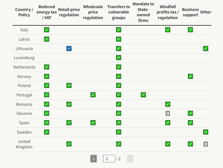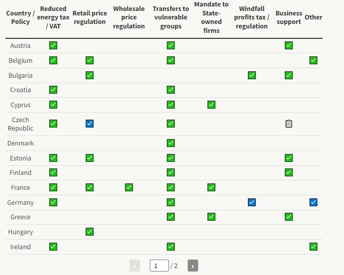 Συνολικά, από τις 27 χώρες που εξετάζονται, οι 20 έχουν μειώσει τους φόρους στην Ενέργεια, 10 έχουν ρυθμίσει ήδη, μέσω κάποιου είδους πλαφόν, τις τιμές χονδρικής ή/και λιανικής, ενώ δύο ακόμα (η Τσεχία και η Λιθουανία) θα προχωρήσουν σε ανάλογη κίνηση το επόμενο διάστημα. Μόνο τρεις χώρες (Ελλάδα, Λουξεμβούργο, Δανία) παρεμβαίνουν για την ελάφρυνση των πολιτών μετά τη διαμόρφωση της τιμής.