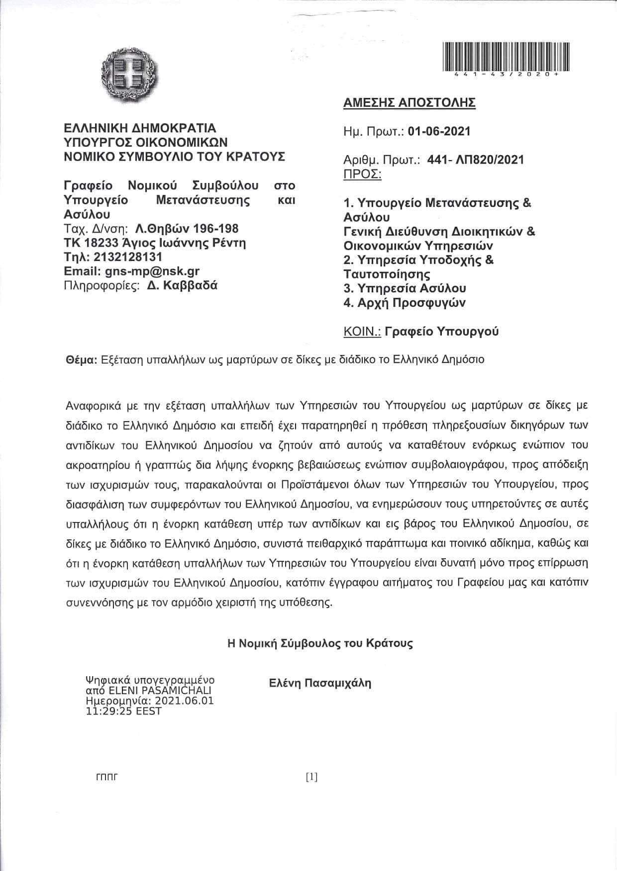 «Υπάρχει πλέον και με τη βούλα “καθεστώς εκτροπής” μέσα στο Δημόσιο. Η χθεσινή εγκύκλιος του Νομικού Συμβούλου του Κράτους στο Υπουργείο Μετανάστευσης και Ασύλου διατάζει τους υπαλλήλους του να μην προσέρχονται ως μάρτυρες σε δίκες που το δημόσιο εγκαλείται για παράνομες πράξεις, διαφορετικά θα διώκονται πειθαρχικά. Η πρωτοφανής εγκύκλιος, μνημείο καταστρατήγησης της ελευθερίας της Δικαιοσύνης, επιτομή της συγκάλυψης κάθε έκνομης πράξης εκ μέρους του Κράτους, δεν πρέπει να έχει προηγούμενο ούτε και στα χρόνια της χούντας. Τα υπόλοιπα αύριο…» έγραψε σε ανάρτησή του ο βουλευτής του ΣΥΡΙΖΑ, δίνοντας στη δημοσιότητα το σχετικό έγγραφο.