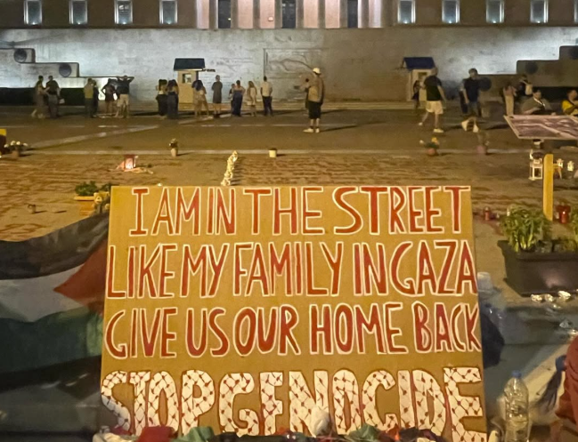 Από τις 21 Ιουνίου ξεκινήσαμε καθιστική διαμαρτυρία μπροστά στην Βουλή των Ελλήνων, στο Σύνταγμα. Στεκόμαστε στο σημείο όπου περιθωριοποιούνται τα δολοφονικά εγκλήματα που συνέβησαν και συνεχίζουν να συμβαίνουν. Στεκόμαστε με τους φίλους και τις οικογένειες των ανθρώπων που δολοφονήθηκαν στα Τέμπη. Ο αγώνας μας είναι κοινός επειδή οι εγκληματίες είναι οι ίδιοι. Η ελληνική κυβέρνηση που είναι συνένοχη στο έγκλημα των Τεμπών, είναι δολοφονικά συνένοχη με το ισραηλινό κράτος που διαπράττει Γενοκτονία.