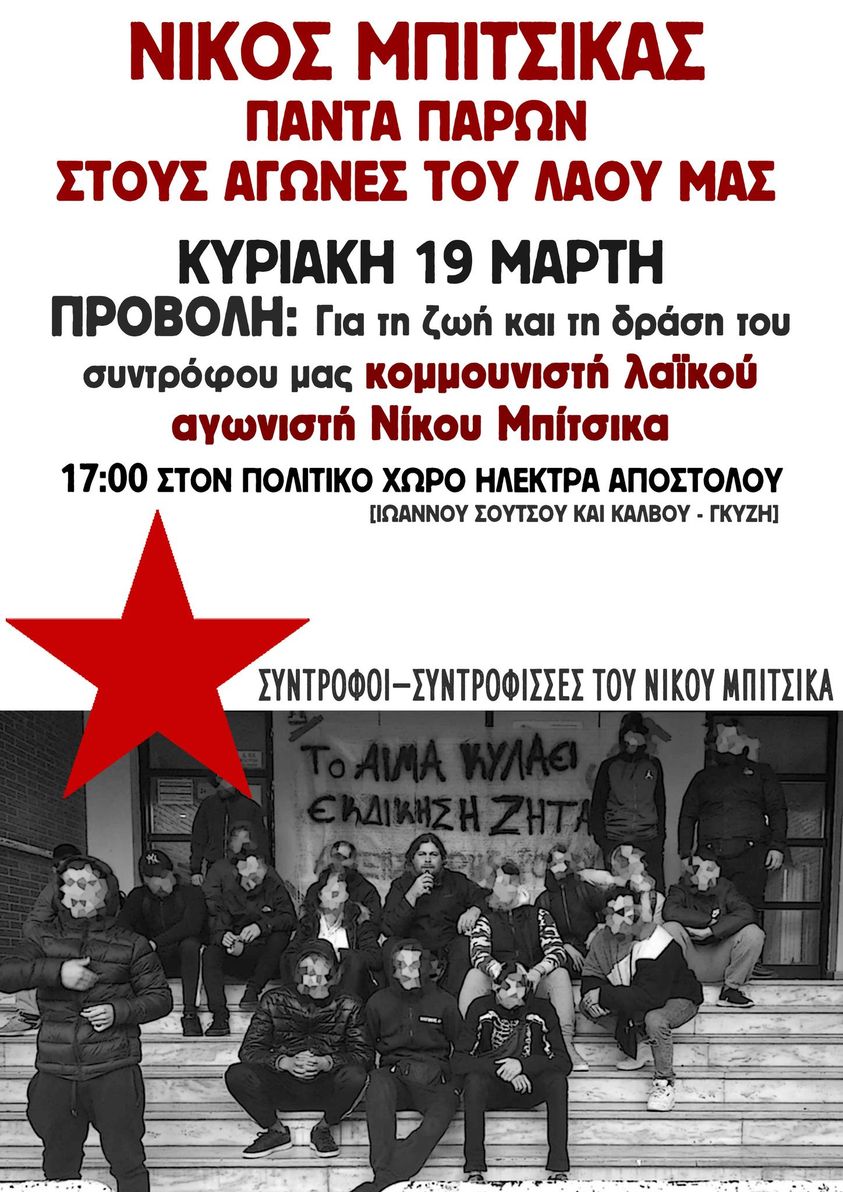 Μετά την περσινή εκδήλωση που σκοπό είχε να μεταγγίσει την πολιτική του δράση στο επαναστατικό-λαϊκό-ανταγωνιστικό κίνημα, φέτος επιλέγουμε να προβάλλουμε ένα βίντεο για την ζωή και την δράση του συντρόφου μας Νίκου Μπίτσικα.