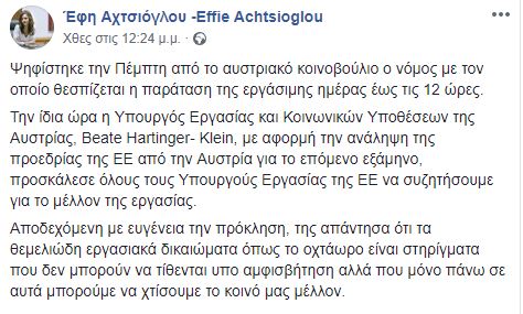 Η Αχτσιόγλου ανέφερε μέσω του προσωπικού της λογαριασμού στο Facebook ότι «ψηφίστηκε την Πέμπτη από το αυστριακό Κοινοβούλιο ο νόμος με τον οποίο θεσπίζεται η παράταση της εργασιακής ημέρας έως τις 12 ώρες. Την ίδια ώρα, η υπουργός Εργασίας και Κοινωνικών Υποθέσεων της Αυστρίας, Beate Hartinger-Klein, με αφορμή την ανάληψη της προεδρίας της ΕΕ από την Αυστρία για το επόμενο εξάμηνο, προσκάλεσε όλους τους υπουργούς Εργασίας της ΕΕ να συζητήσουμε για το μέλλον της εργασίας. Αποδεχόμενη με ευγένεια την πρόσκληση, της απάντησα ότι τα θεμελιώδη εργασιακά δικαιώματα, όπως το οκτάωρο, είναι στηρίγματα που δεν μπορούν να τίθενται υπό αμφισβήτηση, αλλά που μόνο πάνω σε αυτά μπορούμε να χτίσουμε το κοινό μας μέλλον».