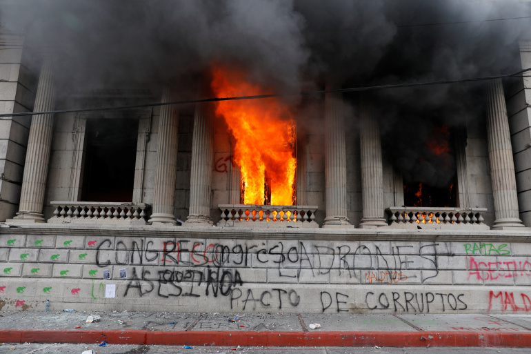 An office of the Congress building is seen after demonstrators set it on fire during a protest demanding the resignation of President Alejandro Giammattei, in Guatemala City, Guatemala November 21, 2020. REUTERS/Luis Echeverria