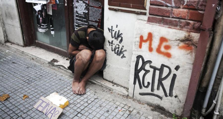 Νεαρός κάθεται δίπλα σε χαρτόνι που γράφει «Πεινάω» σε κεντρικό δρόμο της Θεσσαλονίκης (Konstantinos Tsakalidis / SOOC)