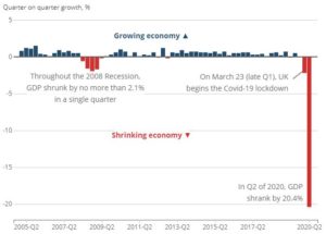 Η Βρετανική οικονομία σημείωσε ρεκόρ ύφεσης το δεύτερο τρίμηνο του 2020, καθώς το ΑΕΠ της χώρας συρρικνώθηκε κατά 20,4% το διάστημα Απριλίου – Ιουνίου -η μεγαλύτερη βουτιά του ΑΕΠ που έχει ποτέ καταγραφεί ποτέ.