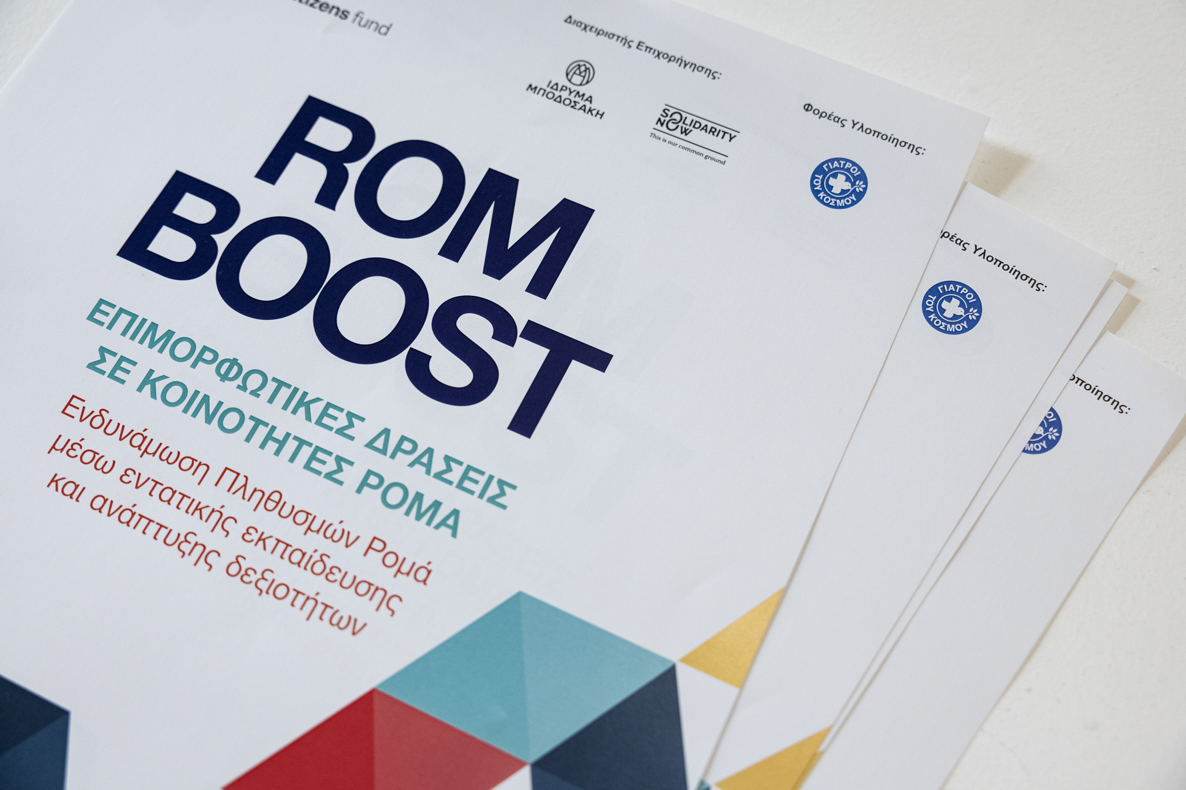 Το έργο Rom-boost υλοποιείται στο πλαίσιο του προγράμματος Active citizens fund, με φορέα υλοποίησης τους Γιατρούς του Κόσμου. Το πρόγραμμα Active citizens fund, ύψους € 15 εκ., χρηματοδοτείται από την Ισλανδία, το Λιχτενστάιν και τη Νορβηγία και είναι μέρος του χρηματοδοτικού μηχανισμού του Ευρωπαϊκού Οικονομικού Χώρου (ΕΟΧ) περιόδου 2014 – 2021, γνωστού ως EEA Grants. Το πρόγραμμα στοχεύει στην ενδυνάμωση και την ενίσχυση της βιωσιμότητας της κοινωνίας των πολιτών και στην ανάδειξη του ρόλου της στην προαγωγή των δημοκρατικών διαδικασιών, στην ενίσχυση της συμμετοχής των πολιτών στα κοινά και στην προάσπιση των ανθρωπίνων δικαιωμάτων. Τη διαχείριση της επιχορήγησης του προγράμματος Active citizens fund για την Ελλάδα έχουν αναλάβει από κοινού το Ίδρυμα Μποδοσάκη και το SolidarityNow.