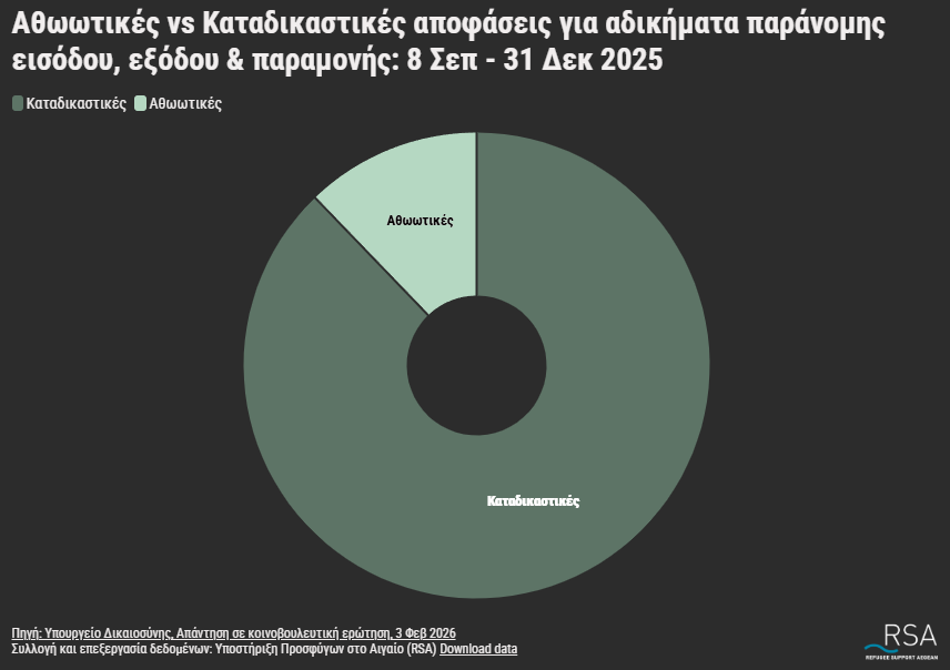 H Υποστήριξη Προσφύγων στο Αιγαίο εξηγεί ότι «μετά από την πρόσφατη τροποποίησή του από τον Ν 5226/2025, το άρθρο 83 Ν 3386/2005 τιμωρεί τα αδικήματα της παράνομης εισόδου, εξόδου και παραμονής στη χώρα με ποινή φυλάκισης τουλάχιστον δύο ετών, η οποία αναστέλλεται μόνο με την έκφραση βούλησης άμεσης αναχώρησης από τη χώρα. Ακόμη και σε περίπτωση αναστολής εκτέλεσης της ποινής, οι καταδικασθείσες/έντες συνεχίζουν να κρατούνται σε φυλακές (σωφρονιστικό κατάστημα) ή Προαναχωρησιακά Κέντρα Κράτησης (ΠΡΟΚΕΚΑ) της Ελληνικής Αστυνομίας μέχρι να αποχωρήσουν από τη χώρα».