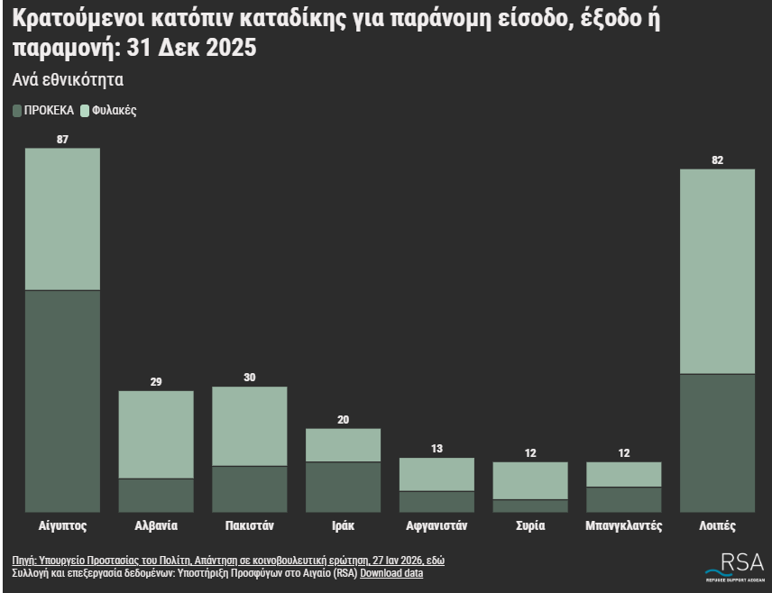 Στα τέλη του περασμένου έτους, σχεδόν 300 άνθρωποι βρίσκονταν υπό κράτηση λόγω καταδικαστικής απόφασης για τα αδικήματα της παράνομης εισόδου, εξόδου ή παραμονής. Συγκεκριμένα, 154 εξέτιαν ποινή φυλάκισης σε φυλακές, ενώ 131 κρατούνταν σε ΠΡΟΚΕΚΑ αφότου εξέφρασαν βούληση για άμεση αναχώρηση από τη χώρα.