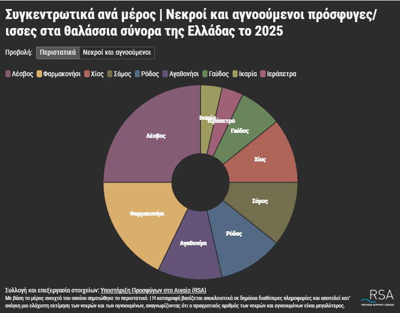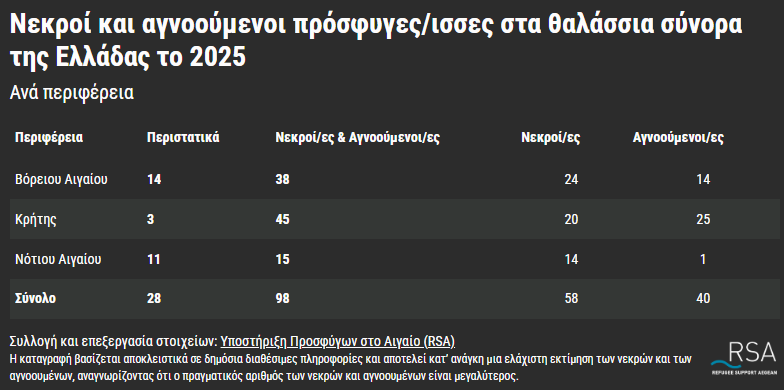 «Από τα 28 θανατηφόρα περιστατικά με νεκρούς/ές ή αγνοούμενους/ες, 14 σημειώθηκαν στο Βόρειο Αιγαίο, 11 στο Νότιο Αιγαίο και 3 στην Κρήτη. Επιπλέον, το 2025 καταγράφηκαν τουλάχιστον 18 γυναίκες και 10 παιδιά νεκρά ή αγνοούμενα» αναφέρει συγκεκριμένα η RSA και τονίζει πως «σε κάποια από αυτά τα περιστατικά υπάρχουν καταγεγραμμένες αναφορές για ενέργειες που χρήζουν ανεξάρτητης διερεύνησης ως πιθανές παραβιάσεις ανθρωπίνων δικαιωμάτων και άσκησης βίας στα σύνορα».