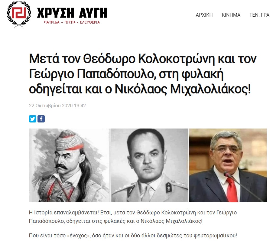 «Η Ιστορία επαναλαμβάνεται! Έτσι, μετά τον Θεόδωρο Κολοκοτρώνη και τον Γεώργιο Παπαδόπουλο, οδηγείται στις φυλακές και ο Νικόλαος Μιχαλολιάκος! Που είναι τόσο «ένοχος», όσο ήταν και οι δύο άλλοι δεσμώτες του ψευτορωμαίικου!» αναφέρει μεταξύ άλλων η ανακοίνωση του ηλεκτρονικού ιστότοπου της ναζιστικής συμμορίας, αγνοώντας τις καταδίκες των υπολοίπων και εστιάζοντας μόνον στη φυλάκιση του αρχηγού της.