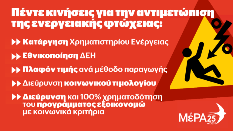 «Από το 2021 μιλάμε για την ανάγκη κατάργησης του χρηματιστηρίου ενέργειας και της οριακής τιμολόγησης. Απευθυνόμαστε σε όλες και όλους: Πρέπει η Κυβέρνηση αλλά και η Ε.Ε. να αναγκαστούν να πάρουν αποφάσεις σαν αυτές που προτείνουμε. Επειδή εξαρτώνται από τα καρτέλ της ενέργειας δεν τις παίρνουν εδώ και τόσο καιρό» επισημαίνει το ΜέΡΑ25.