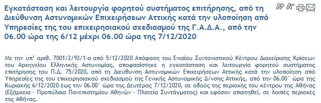 «Με την υπ’ αριθ. 7001/2/92/1-α από 5/12/2020 Απόφαση του Ενιαίου Συντονιστικού Κέντρου Διαχείρισης Κρίσεων του Αρχηγείου Ελληνικής Αστυνομίας, αποφασίστηκε η εγκατάσταση και λειτουργία φορητού συστήματος επιτήρησης του Π.Δ. 75/2020, από τη Διεύθυνση Αστυνομικών Επιχειρήσεων Αττικής κατά την υλοποίηση από Υπηρεσίες της του επιχειρησιακού σχεδιασμού της Γενικής Αστυνομικής Δ/νσης Αττικής, από την 06.00΄ ώρα της Κυριακής 6/12/2020 έως την 06.00΄ ώρα της Δευτέρας 7/12/2020, σε οδούς της περιοχής του κέντρου της Αθήνας (Εξάρχεια – Προπύλαια Πανεπιστημίου Αθηνών – Πλατεία Συντάγματος) και εφόσον απαιτηθεί, σε λοιπές περιοχές της Αθήνας».