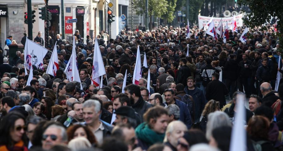 Πλήθος κόσμου συμμετέχει στην πορεία που καλεί το ΠΑΜΕ στο κέντρο της Αθήνας το πρωί της Παρασκευής, κατά του πολυνομοσχεδίου που συζητείται την ίδια ώρα στην Ολομέλεια της Βουλής.
