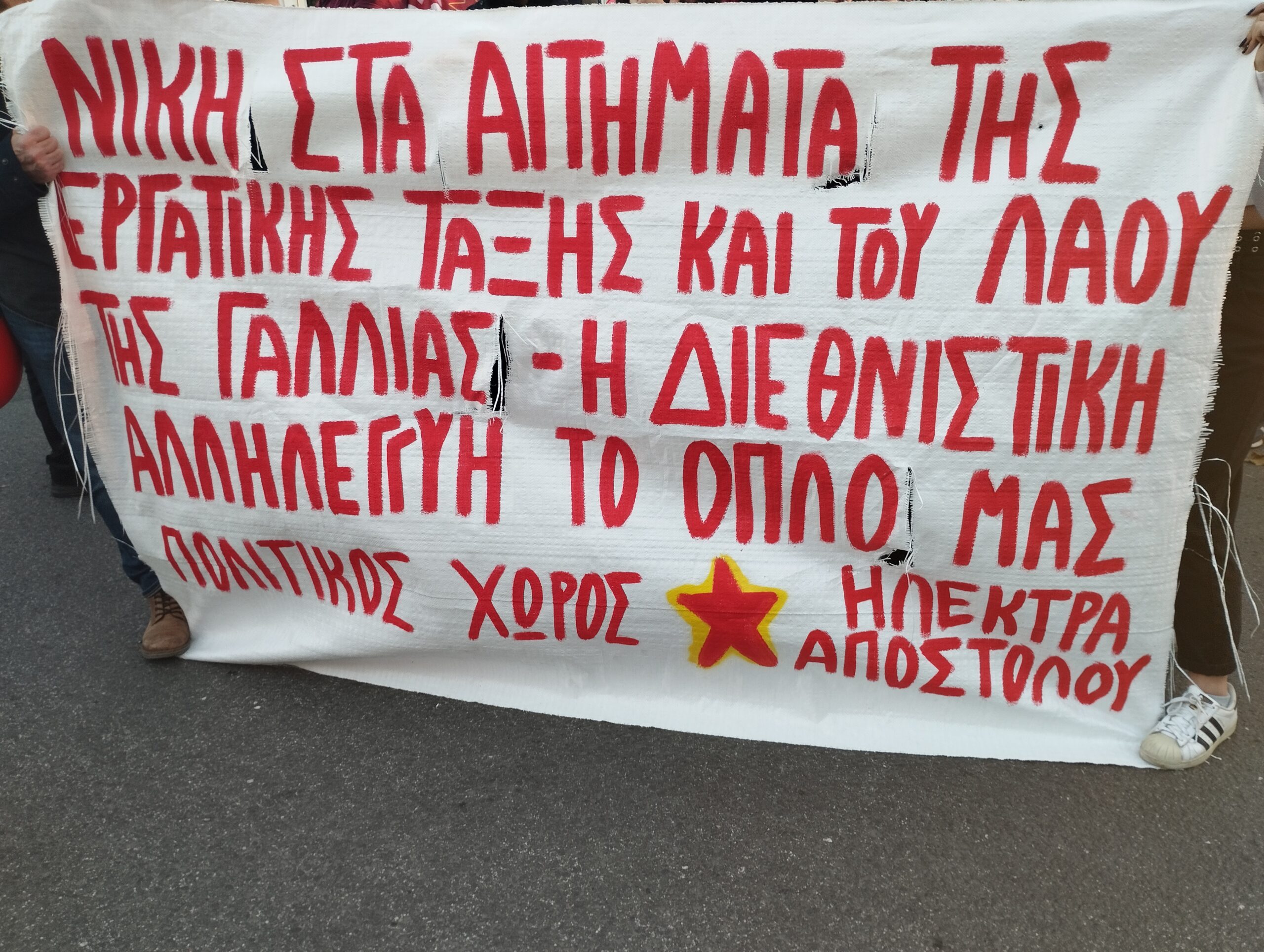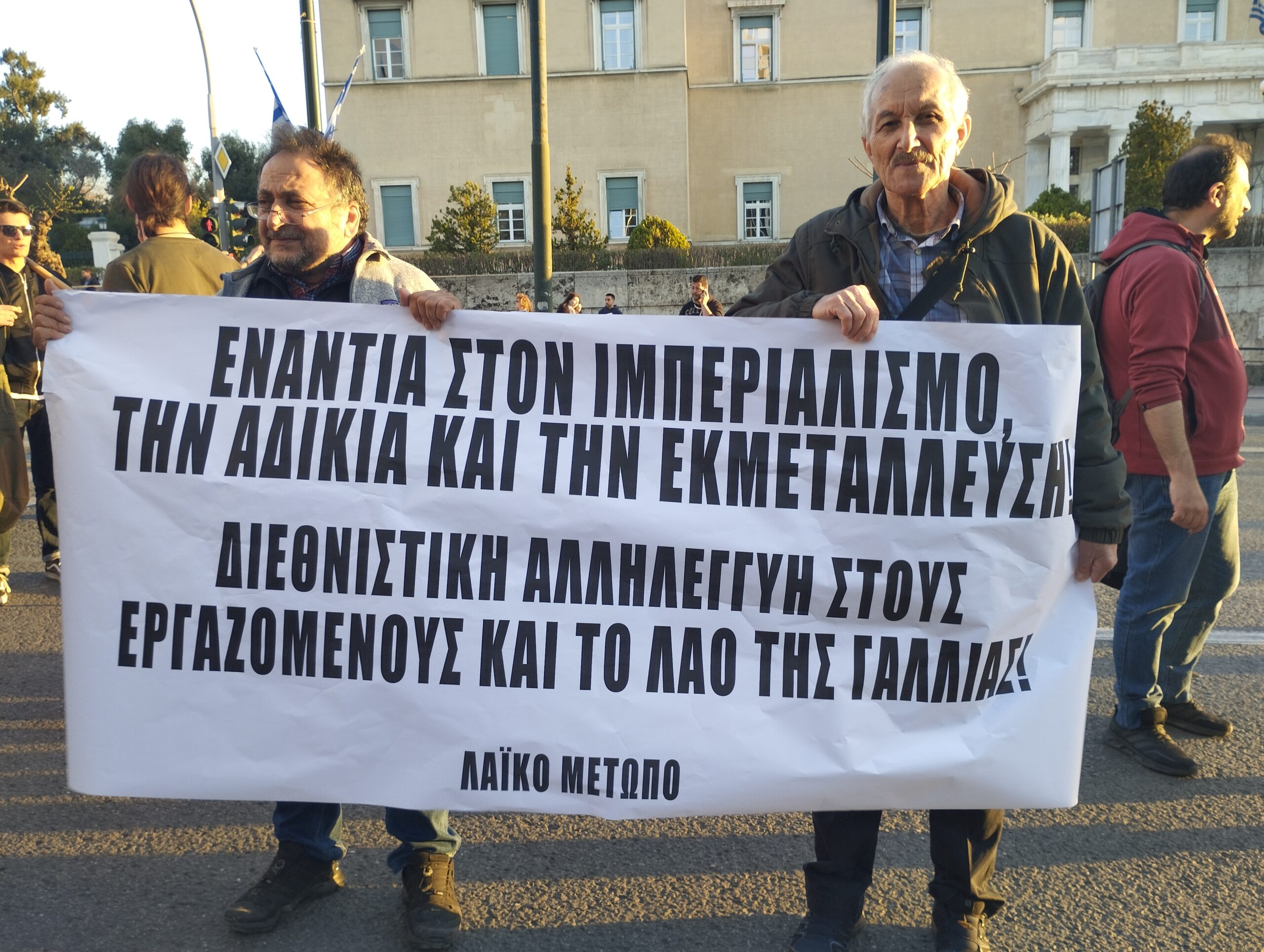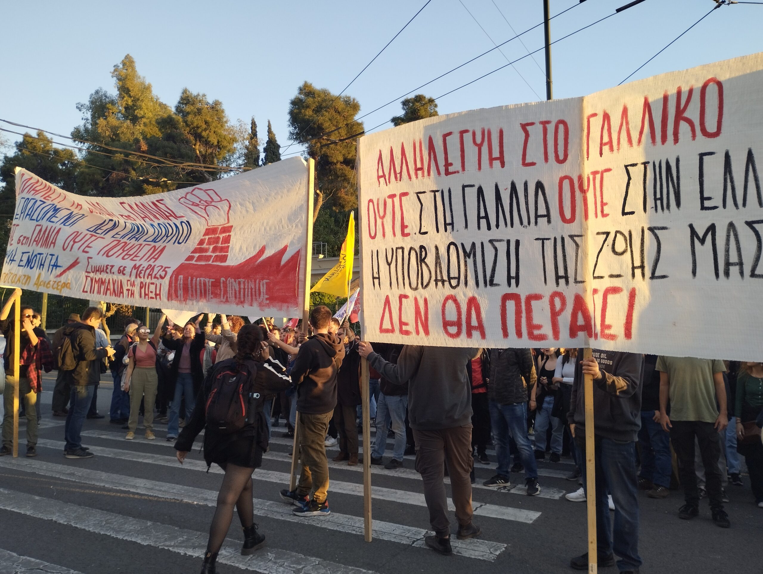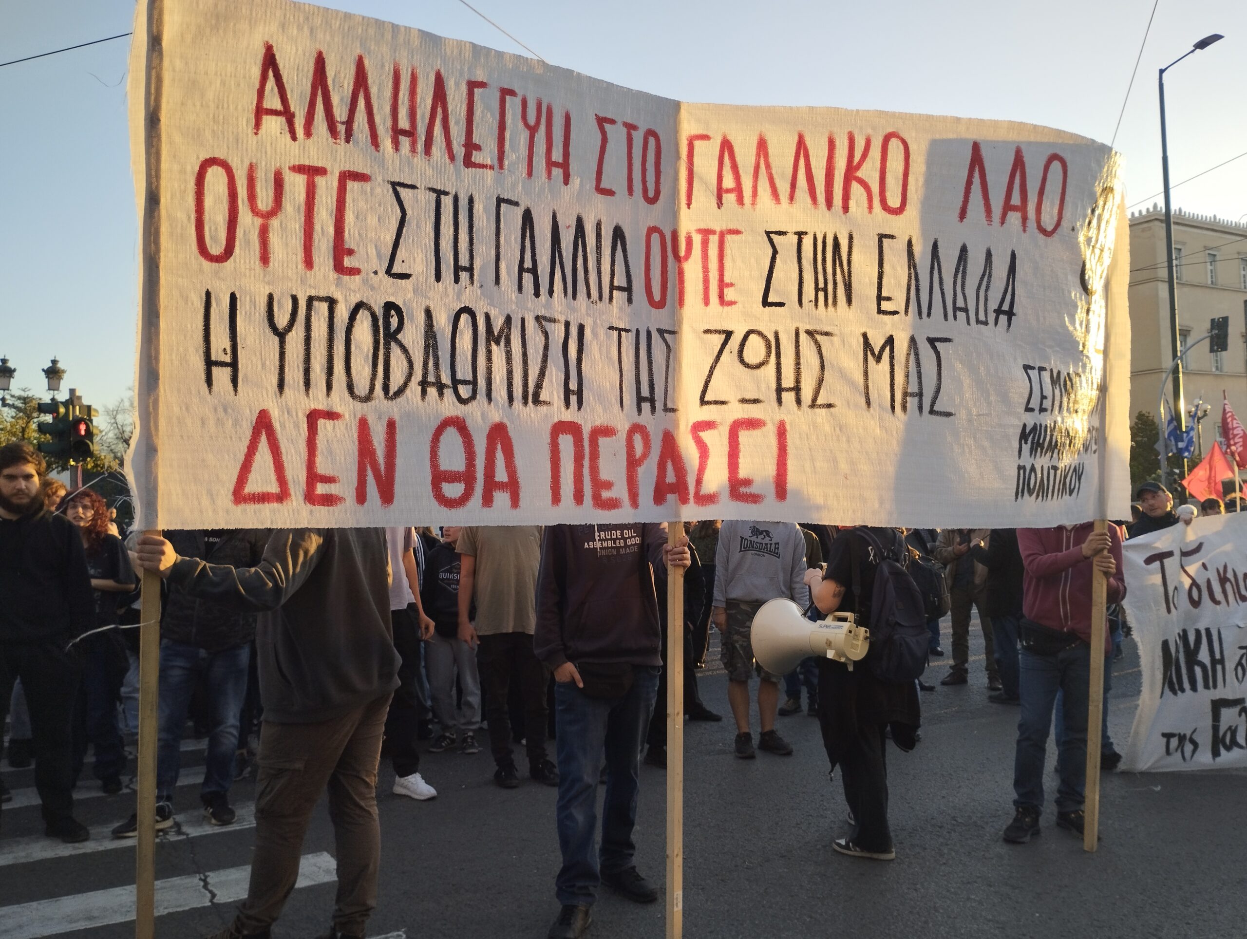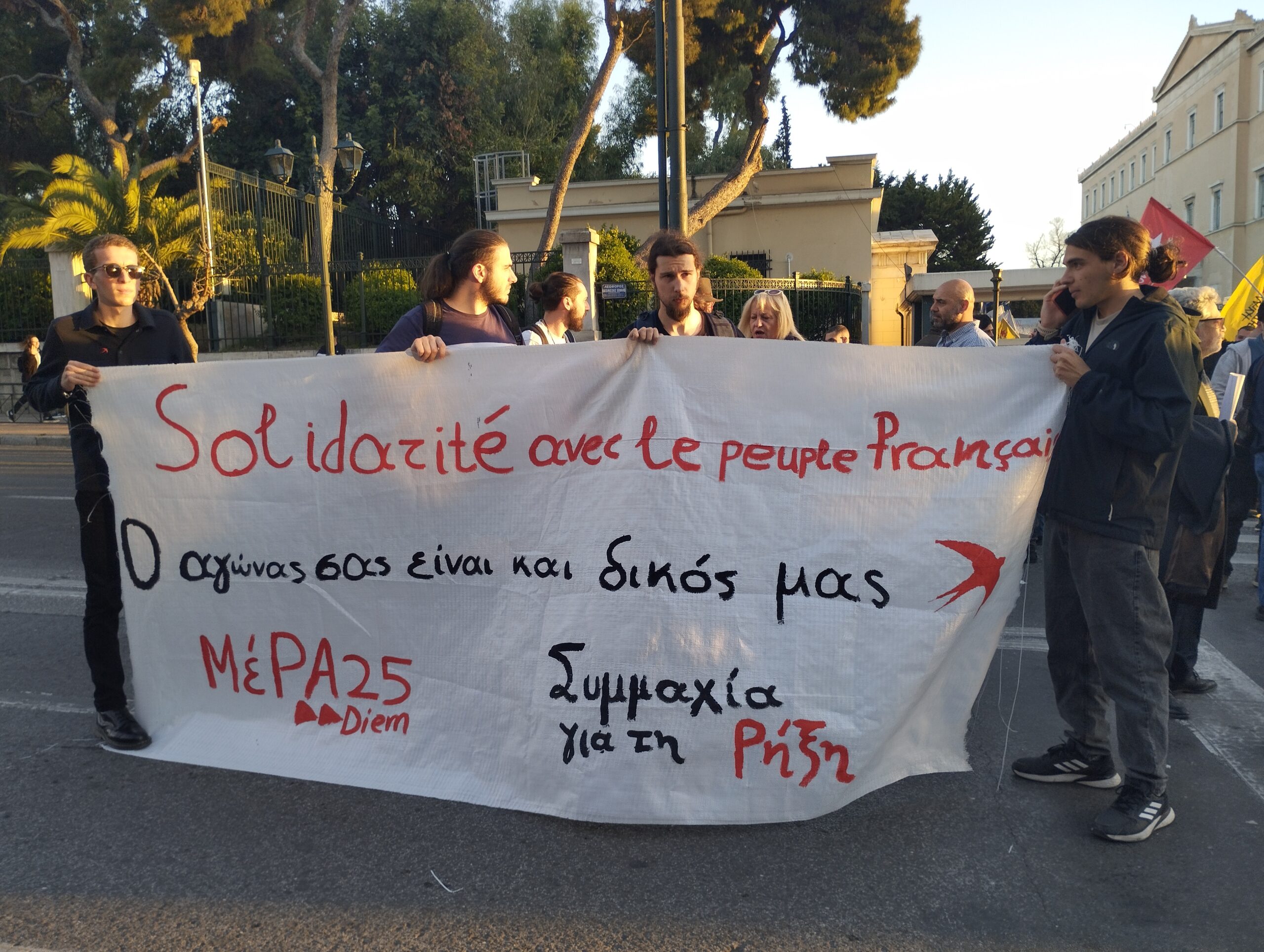 Η διαμαρτυρία πραγματοποιείται σε ένδειξη αλληλεγγύης προς τις κινητοποιήσεις του γαλλικού λαού ενάντια στη συνταξιοδοτική μεταρρύθμιση της κυβέρνησης Μακρόν.