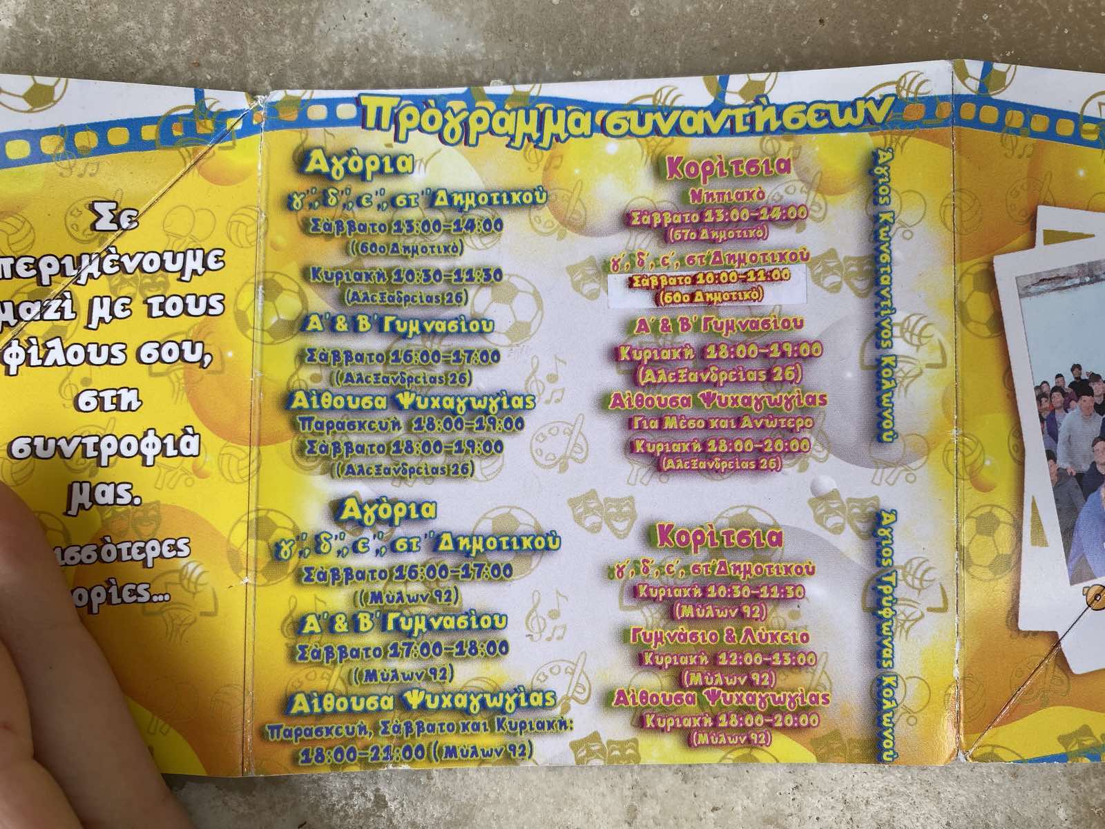 Παραπάνω φαίνεται για παράδειγμα το φυλλάδιο που μοιράστηκε απο την Ιεράς Αρχιεπισκοπή Αθηνών με τίτλο «Νεανικές Ενοριακές Συντροφιές» που μοιράστηκε σε δημοτικά σχολεία του Κολωνού.