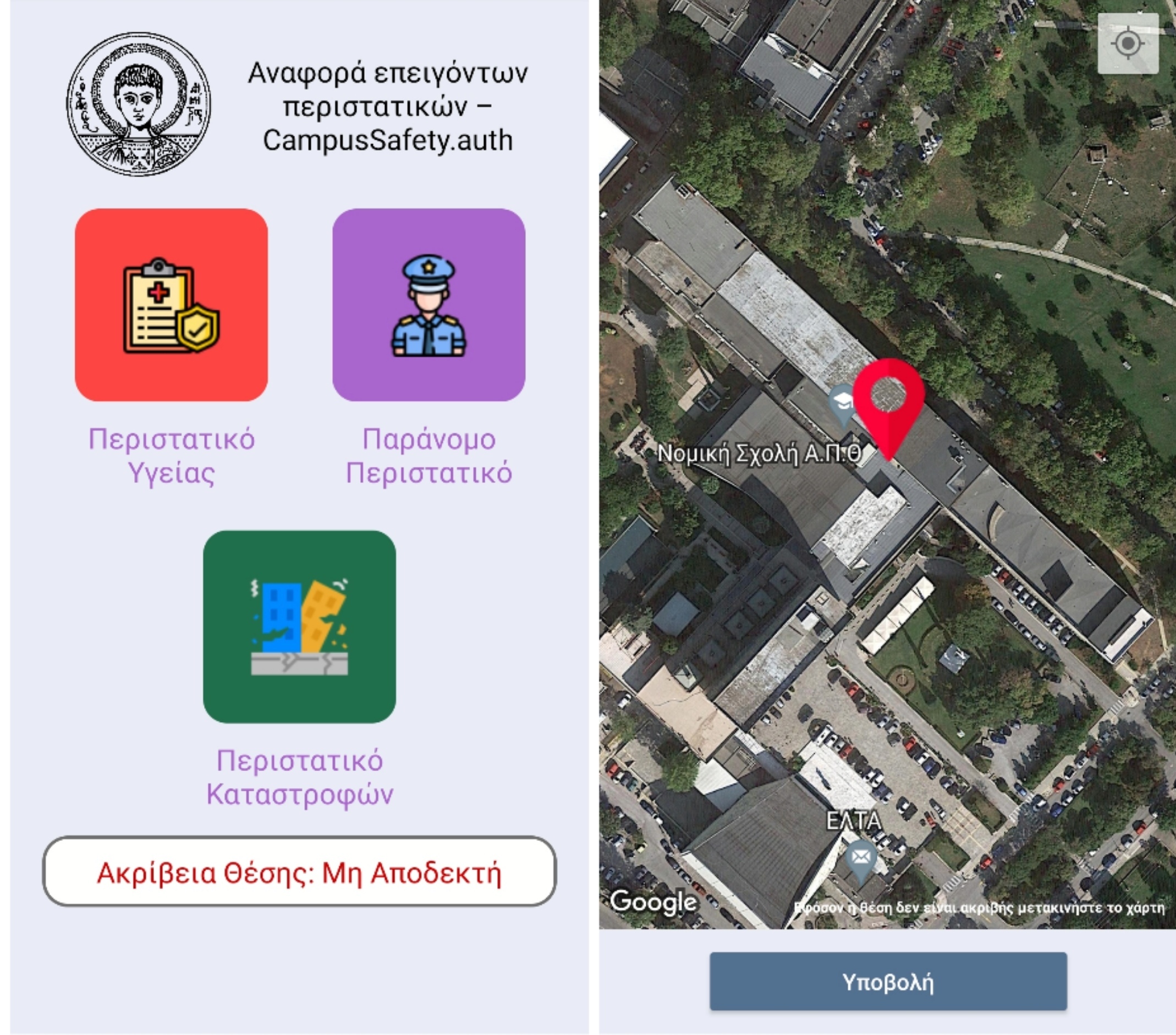 Τα μέλη της πανεπιστημιακής κοινότητας μέσω της εφαρμογής «AUTh Campus Safety», που είναι διαθέσιμη μέσω της ψηφιακής πλατφόρμας διανομής εφαρμογών «GooglePlay» έχουν τη δυνατότητα να κοινοποιούν σε πραγματικό χρόνο στα αρμόδια όργανα του Πανεπιστημίου τη θέση όπου λαμβάνει χώρα ένα επείγον περιστατικό, το οποίο αφορά απειλή ασφάλειας, παράνομη δραστηριότητα και καταστροφές, ή κίνδυνο υγείας, ώστε να κινητοποιείται άμεσα η υπηρεσία ασφάλειας του ΑΠΘ και να δρομολογούνται οι απαραίτητες ενέργειες.