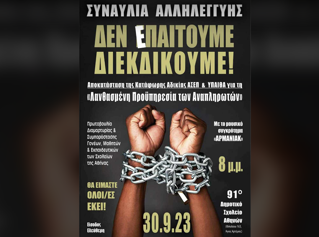 Γονείς, μαθητές και εκπαιδευτικοί των σχολείων της Αθήνας, θεωρούμε εξοργιστικό να καλούνται οι αναπληρωτ(ρι)ές να υπερκαλύψουν το κρατικό έλλειμμα με ατομική ευθύνη και να τιμωρούνται παραδειγματικά, για τα λάθη και τις αστοχίες του συστήματος.