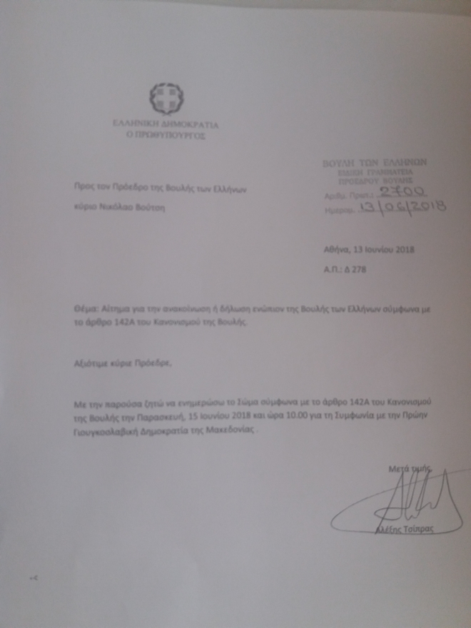 Το σχετικό αίτημα να ενεργοποιηθεί το άρθρο 142Α του Κανονισμού της Βουλής για την ανακοίνωση ή δήλωση του πρωθυπουργού, ενώπιον της Βουλής κατατέθηκε από τον Αλέξη Τσίπρα στον πρόεδρο της Βουλής, Νίκο Βούτση.