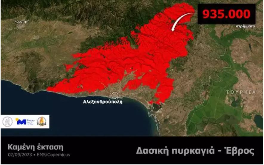 Συγκεκριμένα, όπως αναφέρει το meteo.gr του Εθνικού Αστεροσκοπείου Αθηνών, νεότερα δορυφορικά δεδομένα έγιναν, σήμερα (03/09), διαθέσιμα από την Υπηρεσία Ταχείας Χαρτογράφησης Copernicus της Ευρωπαϊκής Επιτροπής, για την μεγαλύτερη δασική πυρκαγιά των τελευταίων πάρα πολλών ετών σε ευρωπαϊκό έδαφος στον Έβρο. Όπως προκύπτει από την ανάλυση των δορυφορικών δεδομένων, η συνολική έκταση που κατέκαψε η δασική πυρκαγιά του Έβρου, η οποία προέκυψε από τη συνένωση των πυρκαγιών σε Αλεξανδρούπολη και Δαδιά, ξεπερνά τα 935.000 στρέμματα (έως τις 11:31 π.μ. του Σαββάτου 02/09).