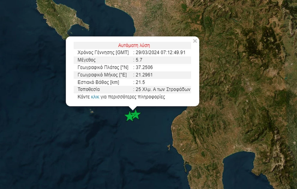 Σύμφωνα με την αναθεωρημένη εκτίμηση του Ινστιτούτου, ο πρώτος σεισμός ήταν τελικά μεγέθους 4,5 Ρίχτερ (και όχι 5,6 όπως ήταν η αρχική εκτίμηση) , είχε επίκεντρο τα 21 χιλιόμετρα Ανατολικά των Στροφάδων και εστιακό βάθος τα 15,4 χιλιόμετρα.