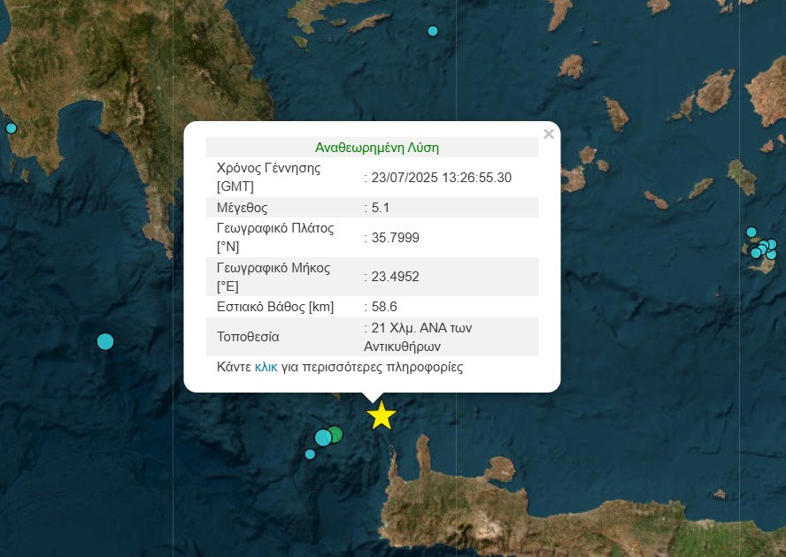 Σύμφωνα με το Γεωδυναμικό Ινστιτούτο, ο σεισμός είχε εστιακό βάθος 58,6 χιλιομέτρων και το επίκεντρο βρίσκεται 21 χλμ. ανατολικά των Αντικυθήρων.