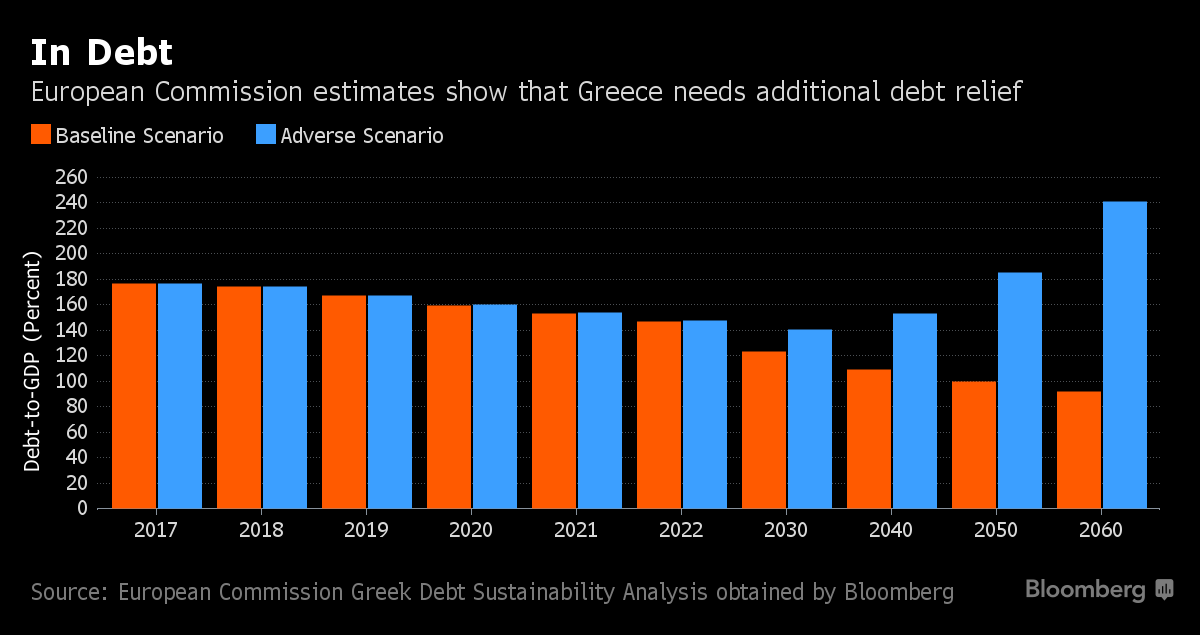 Η Κομισιόν βλέπει την ανάγκη για «εφαρμογή επιπρόσθετων μέτρων περιορισμού του χρέους που θα χτιστούν επί των όρων και των δεσμεύσεων που περιλαμβάνονται στις δηλώσεις του Eurogroup στις 25 Μαΐου και στις 15 Ιουνίου». Όπως αναφέρει το «δυσμενές σενάριο» της Κομισιόν, το χρέος μπορεί να φτάσει και το 241% του ΑΕΠ το 2060%.
