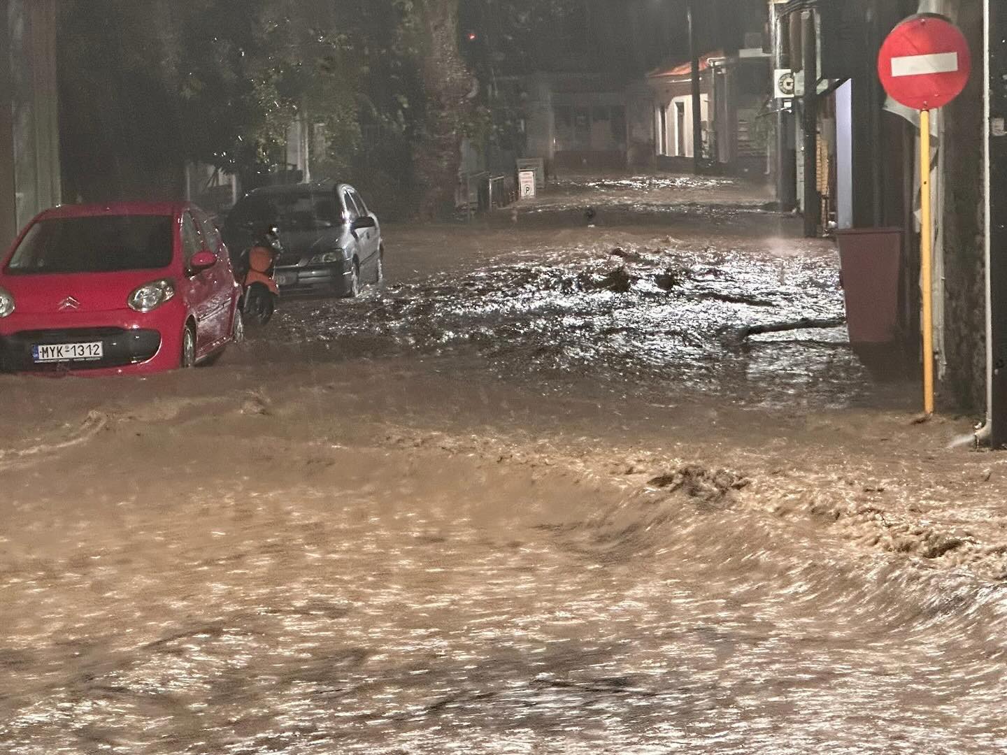According to residents, the Tsiknias River overflowed its banks, sending huge volumes of water into Kalloni. In several places the water level exceeded half a metre, submerging roads, courtyards and parked cars.