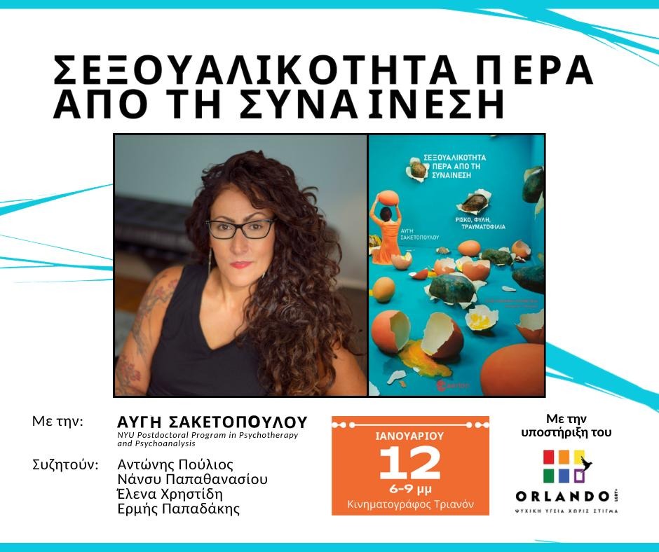 Η εκδήλωση γίνεται με αφορμή την ελληνική έκδοση του βιβλίου της Δρ. Σακετοπούλου με τίτλο «Σεξουαλικότητα πέρα από τη συναίνεση: Ρίσκο, Φυλή, Τραυματοφιλία», ένα βιβλίο που έχει συζητηθεί διεθνώς και που έχει παραγωγικά αμφισβητήσει καθιερωμένες ιδέες γύρω από την ίαση του τραύματος, τον ρόλο της καταφατικής συναίνεσης, την ερωτική υφή της φυλετικότητας, και που έχει εισαγάγει δυναμικά την έννοια της «τραυματοφιλίας» και του «επιτακτικού σαδισμού.»