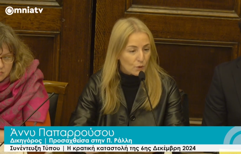 Υπενθυμίζεται, ότι μετά τα χτυπήματα και την προσαγωγή της δικηγόρου από τις δυνάμεις καταστολής στις 6 Δεκεμβρίου, η κα. Παπαρούσου είπε στο ΤΡP πως αφέθηκε ελεύθερη, όπως και οι υπόλοιποι προσαχθέντες, καταγγέλλοντας πως αφορμή για τη βίαιη προσαγωγή της ήταν το γεγονός ότι διαμαρτυρήθηκε κατά των παράνομων προληπτικών προσαγωγών διαδηλωτών.