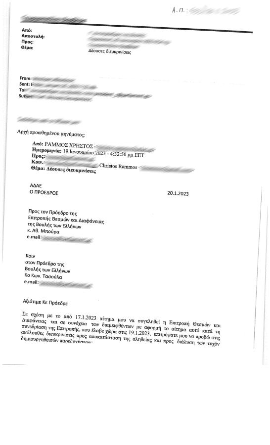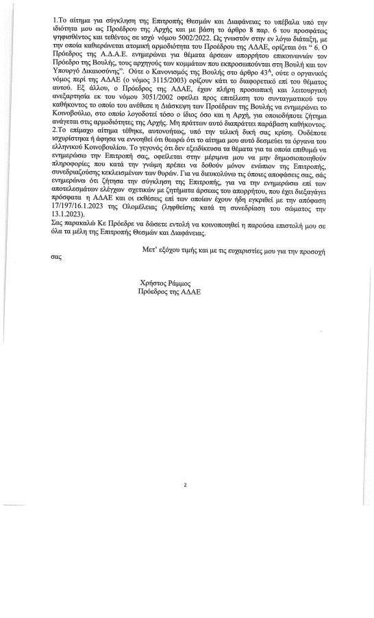 «Το αίτημα για σύγκλιση της Επιτροπής Θεσμών και Διαφάνειας το υπέβαλα υπό την ιδιότητά του ως προέδρου της Αρχής και με βάση το άρθρο 8 παράγραφος 6 του προσφάτως ψηφισθέντος και τεθέντος σε ισχύ νόμου 5002/2022. Ως γνωστόν στην εν λόγω διάταξη, με την οποία καθιερώνεται ατομική αρμοδιότητα του προέδρου της ΑΔΑΕ, ορίζεται ότι “6. Ο πρόεδρος της ΑΔΑΕ ενημερώνει για θέματα άρσεων απορρήτου επικοινωνιών τον πρόεδρο της Βουλής, τους αρχηγούς των κομμάτων που εκπροσωπούνται στη Βουλή και τον υπουργό Δικαιοσύνης”» αναφέρει στην επιστολή του ο πρόεδρος της ΑΔΑΕ.