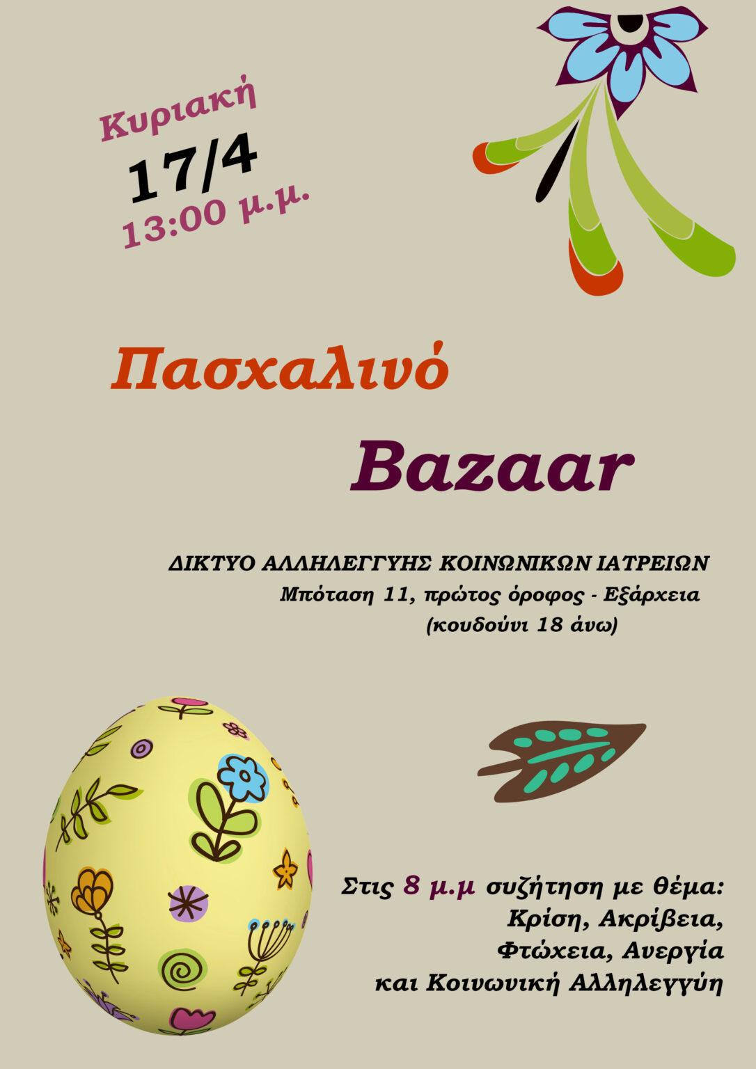 Βιβλία, χειροποίητα τεχνουργήματα, γλυκά, αλλά και συζήτηση (με θέμα την κρίση και την κοινωνική αλληλεγγύη) θα έχει στο Bazaar. Στο τέλος της εκδήλωσης οι παρευρισκόμενοι θα ανταλλάξουν ευχές με κάποιους μεζέδες!