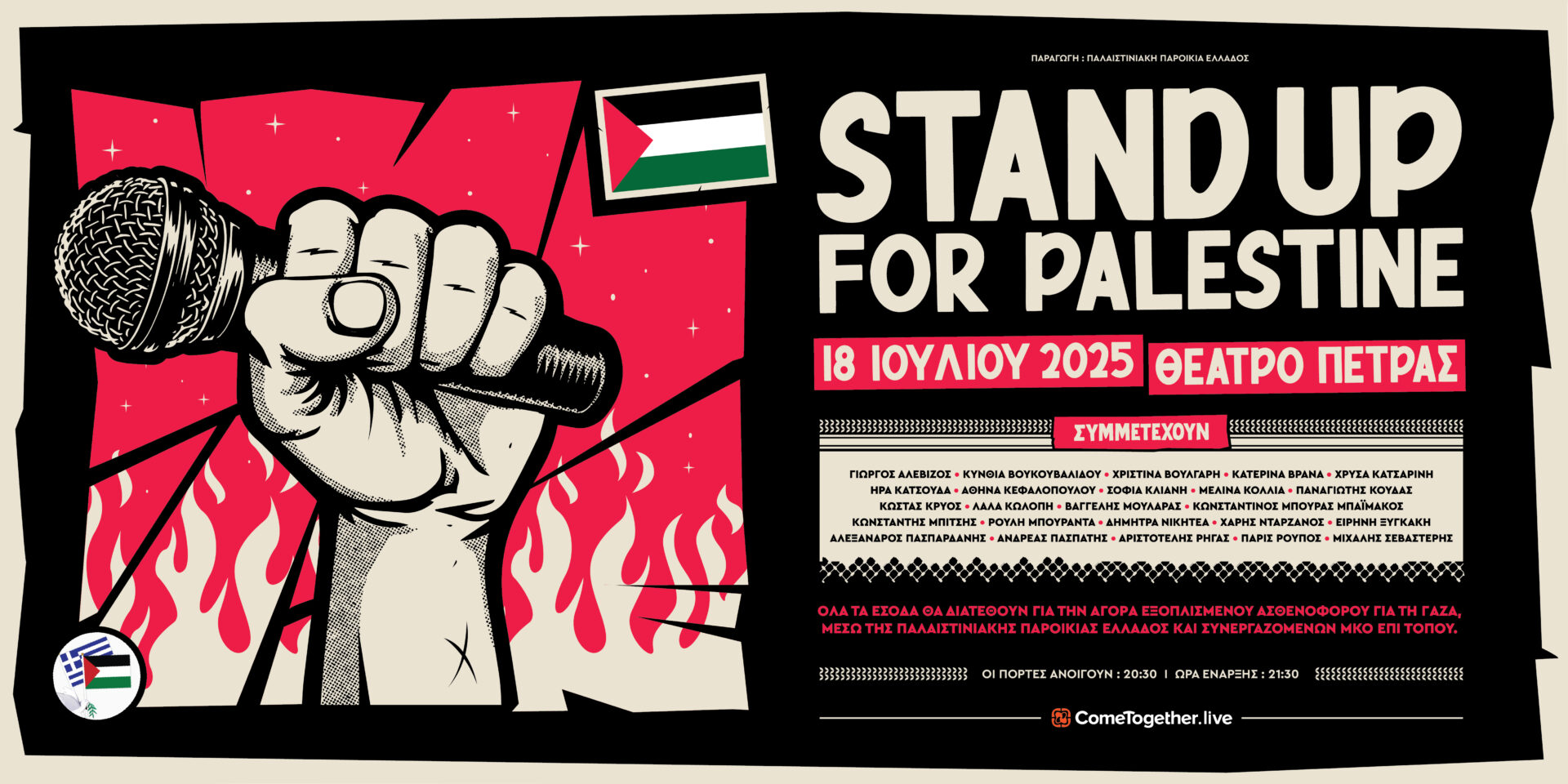 Αύριο Παρασκευή 18 Ιουλίου 2025 στο Θέατρο Πέτρας, στην Πετρούπολη 24 κωμικοί θα ενώσουν τις φωνές τους για την Παλαιστίνη και συγκεκριμένα με στόχο την αγορά ενός ασθενοφόρου.