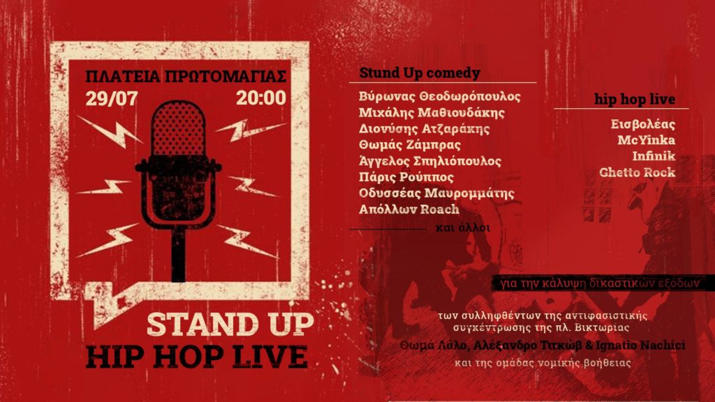 Stand Up και Hip Hop Live αλληλεγγύης θα διεξαχθεί την Τετάρτη 29 Ιουλίου στο Σκοπευτήριο της Καισαριανής με αφορμή τον ξυλοδαρμό και τη σύλληψη τριών ατόμων από την αστυνομία κατά τη διάρκεια της συντονισμένης αποχώρησης μπλοκ διαδηλωτών από την αντιρατσιστική συγκέντρωση της πλατείας Βικτωρίας την Τετάρτη 15 Ιουλίου.