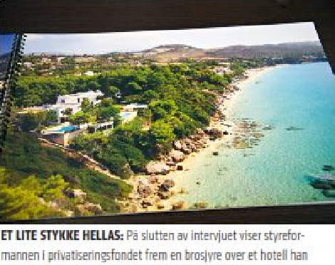 (Κείμενο-λεζάντα, από την έντυπη έκδοση της εφημερίδας): Στο τέλος της συνέντευξης ο πρόεδρος του ΤΑΙΠΕΔ μας έδειξε τη μπροσούρα από ένα ξενοδοχείο που έχει στην Κεφαλονιά καθώς και τη δική του βίλα με δυο πισίνες.