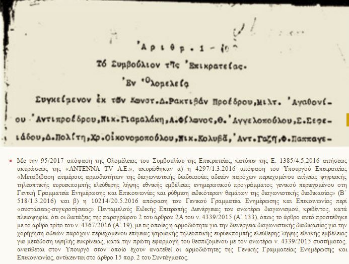 «Με την 95/2017 απόφαση της Ολομέλειας του Συμβουλίου της Επικρατείας, κατόπιν της Ε. 1385/4.5.2016 αιτήσεως ακυρώσεως της «ANTENNA TVΑ.Ε.», ακυρώθηκαν α) η 4297/1.3.2016 απόφαση του Υπουργού Επικρατείας «Μεταβίβαση επιμέρους αρμοδιοτήτων της διαγωνιστικής διαδικασίας αδειών παρόχων περιεχομένου επίγειας ψηφιακής τηλεοπτικής ευρυεκπομπής ελεύθερης λήψης εθνικής εμβέλειας ενημερωτικού προγράμματος γενικού περιεχομένου στη Γενική Γραμματεία Ενημέρωσης και Επικοινωνίας και ρύθμιση ειδικότερων θεμάτων της διαγωνιστικής διαδικασίας» (Β΄ 518/1.3.2016) και β) η 10214/20.5.2016 απόφαση του Γενικού Γραμματέα Ενημέρωσης και Επικοινωνίας περί «συστάσεως-συγκροτήσεως» Πενταμελούς Ειδικής Επιτροπής Διενέργειας του ανωτέρω διαγωνισμού, κριθέντος, κατά πλειοψηφία, ότι οι διατάξεις της παραγράφου 2 του άρθρου 2Α του ν. 4339/2015 (Α΄ 133), όπως το άρθρο αυτό προστέθηκε με το άρθρο τρίτο του ν. 4367/2016 (Α΄ 19), με τις οποίες η αρμοδιότητα για την διενέργεια διαγωνιστικής διαδικασίας για την χορήγηση αδειών παρόχων περιεχομένου επίγειας ψηφιακής τηλεοπτικής ευρυεκπομπής ελεύθερης λήψης εθνικής εμβέλειας για μετάδοση υψηλής ευκρίνειας, κατά την πρώτη εφαρμογή του θεσπιζομένου με τον ανωτέρω ν. 4339/2015 συστήματος, ανατίθεται στον Υπουργό στον οποίο έχουν ανατεθεί οι αρμοδιότητες της Γενικής Γραμματείας Ενημέρωσης και Επικοινωνίας, αντίκεινται στο άρθρο 15 παρ. 2 του Συντάγματος».